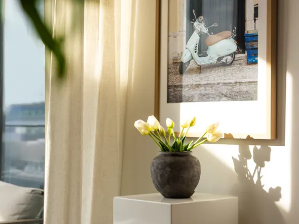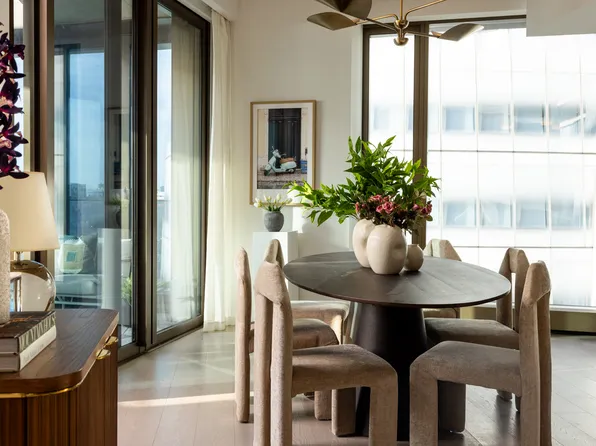 The condo's soaring ceilings range from 9’8" to 10’4". Enjoy stunning western, northern, and eastern vistas of the Midtown skyline, Empire State Building, and Midtown Hudson River through expansive floor-to-ceiling casement windows with motorized shades.