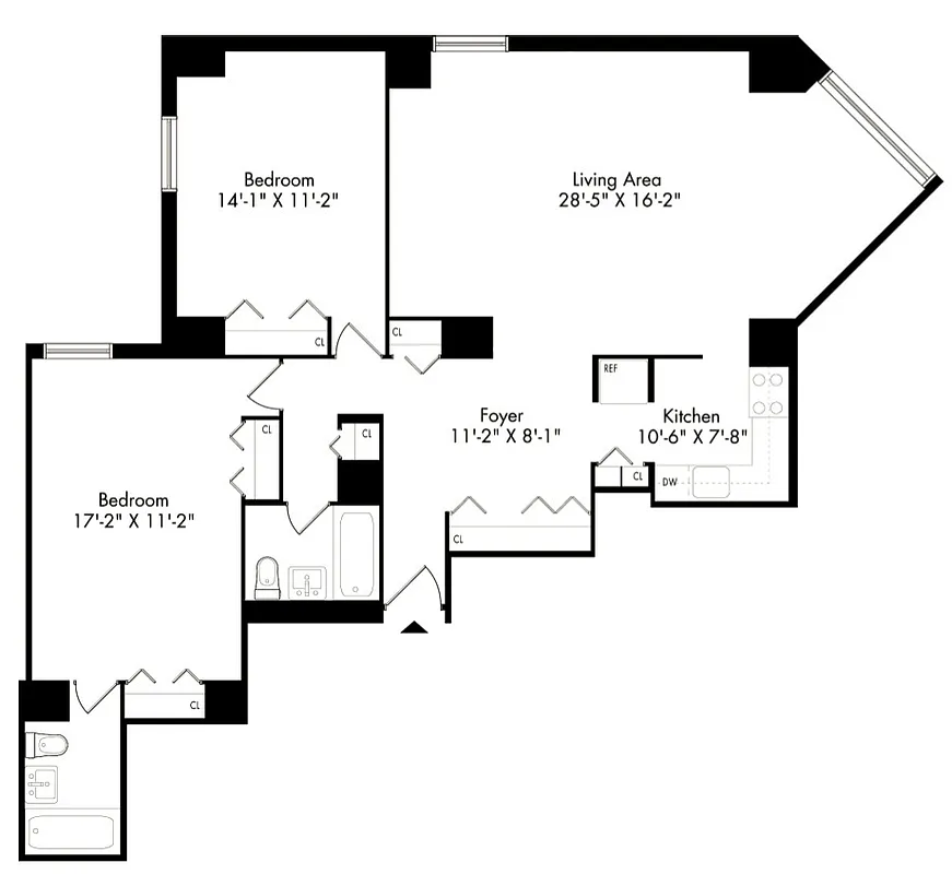 Two bedroom, two bath apartment featuring a floor to ceiling renovation by WhiteHall Interiors. This residence offers a chef's kitchen with quartz counters and full backsplash, top of the line appliances, spacious extended living room, master en suite bath, and desert oak flooring throughout. Mid floor northwest/west/south views of the city and plaza. 1062 sq ft. Available now.