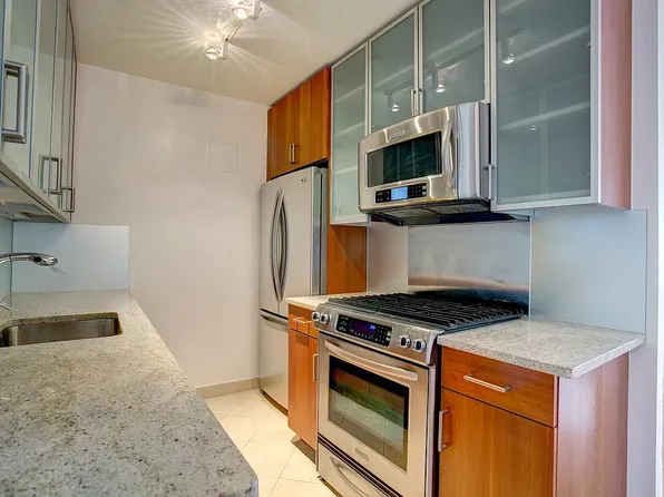 Renovated one bedroom with northern views. Features a pass-through kitchen with breakfast bar and stainless-steel appliances, beautiful plank flooring, large bay windows in the living room, updated bathroom finishes, and generous closet space.